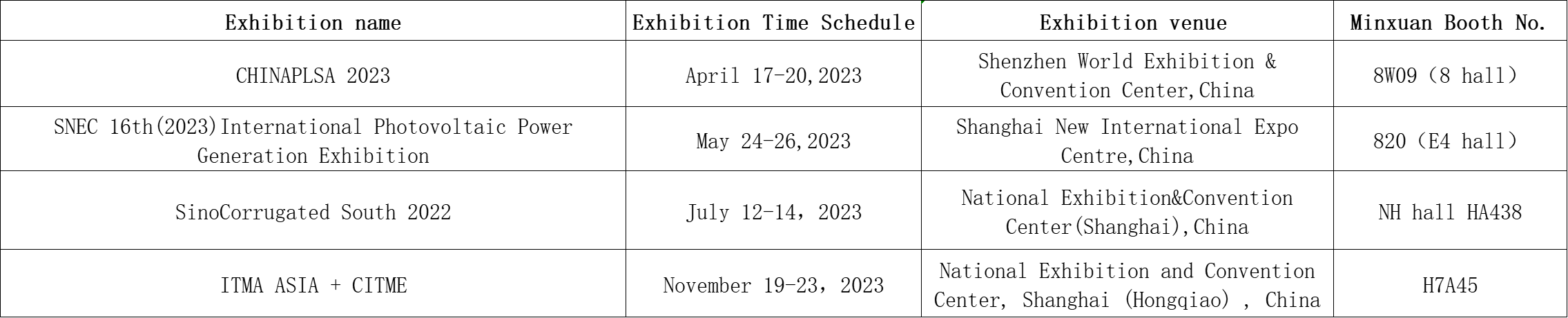 Dear customers and friends:  The following is the exhibition information of our company's Minxuan Technology in 2023. At that time, we sincerely invite you to visit the company's booth for guidance.