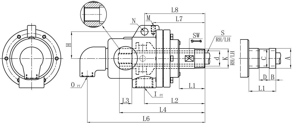 | Model | K | I | O | S1 | d | L1 | L2 | L3 | L4 | L6 | L7 | L8 | M | N | H | SW | 法蘭式外管尺寸對照表 | |||