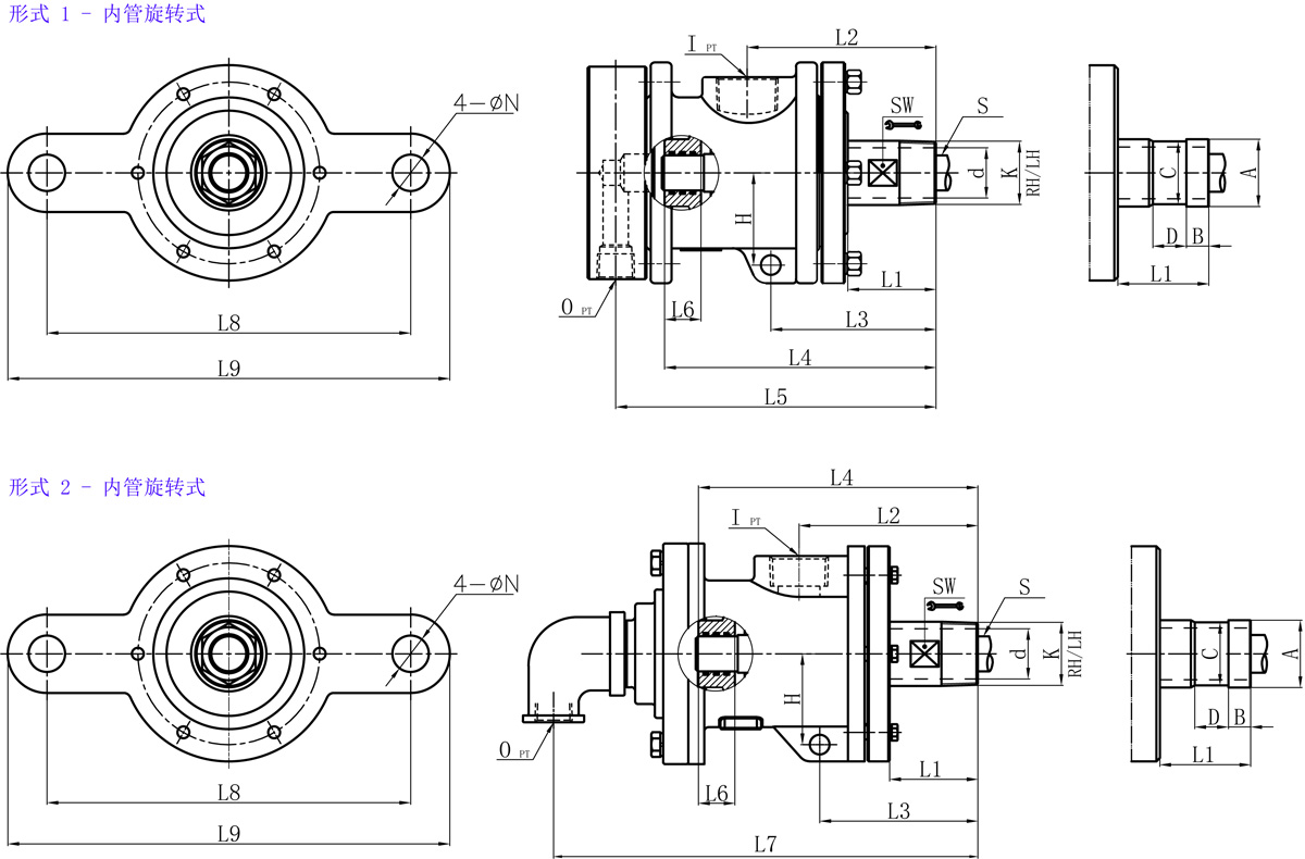 | Model | K | I | O | S1 | d | L1 | L2 | L3 | L4 | L5 | L6 | L7 | L8 | L9 | N | SW | H | 法蘭式外管尺寸對照表 | |||