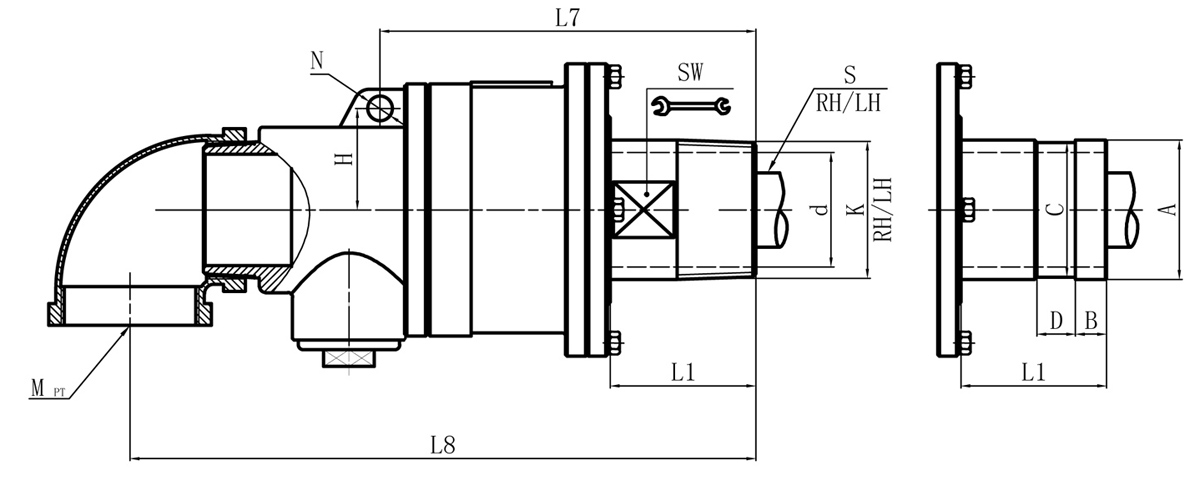 | Model | K | M | I | O | S | S1 | D1 | L1 | L2 | L3 | L5 | L6 | L7 | L8 | N | SW | H | 法蘭式外管尺寸對照表 | |||